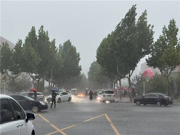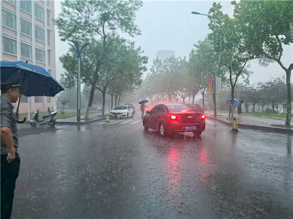正在山东水利职业学院重生报到车辆次要入口,进出车辆正在风雨交加下视线受阻,呈现乱停乱放的环境导致道拥堵。踩着积水,对车辆进行疏导,保障了重生报到顺畅进行,获得校方工做人员的高度承认。